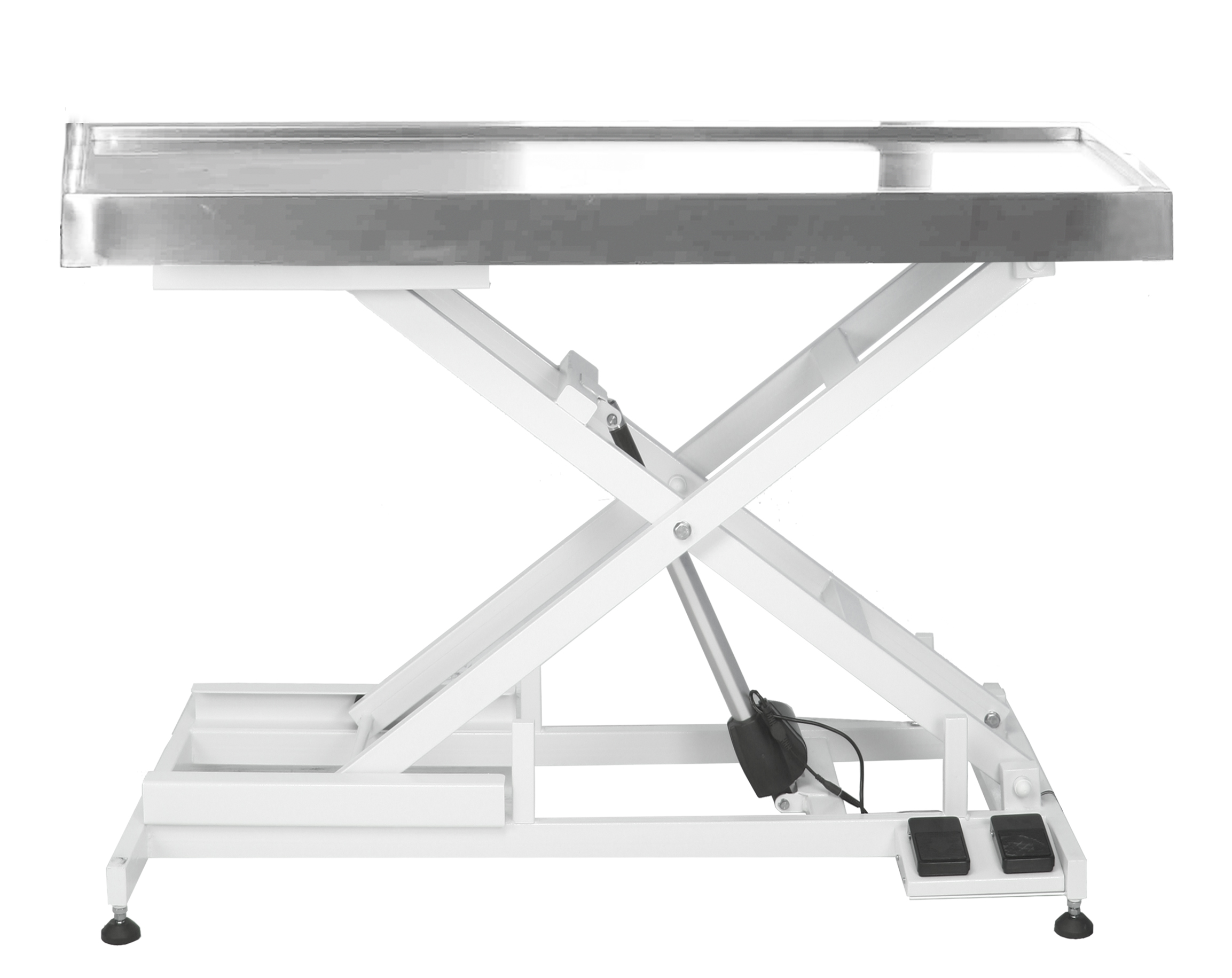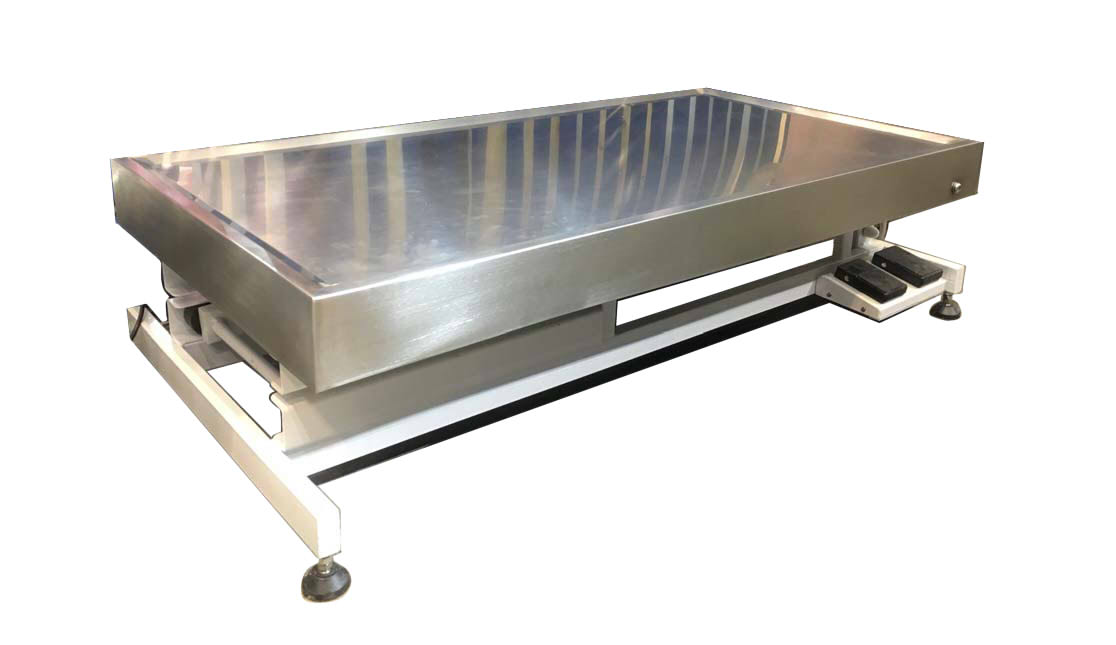Table vétérinaire polyvalente avec système de levage électrique performant. Inclinaison du plateau jusqu'à 15° grâce à un verrin hydraulique.